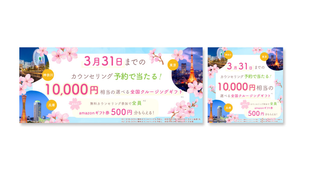 バナー作成 2025年9月18日 最終更新日時 : 2025年9月18日 hnchaaan 【製作時間】3時間/1枚【使用ソフト】Photoshop・illustrator【担当業務】デザイン【意識した亊】春らしい季節感が伝わるデザインにしました。